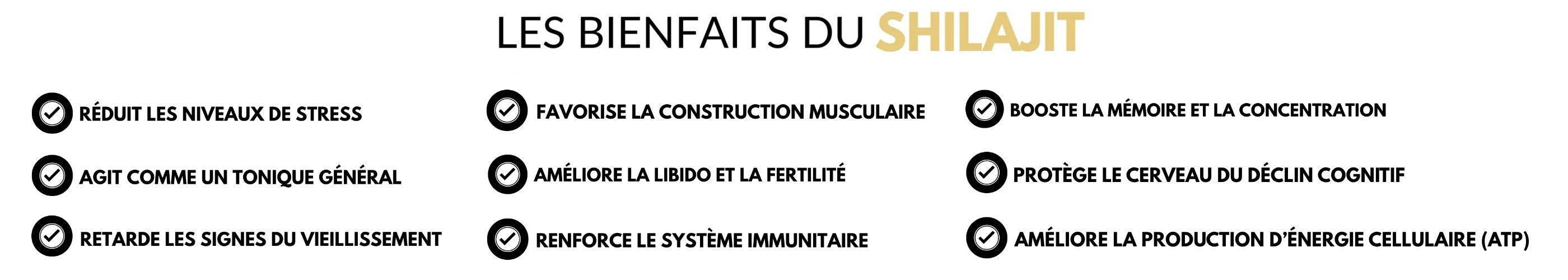Résultats observés dans des études publiées entre 2010 et 2023 sur le Shilajit purifié.