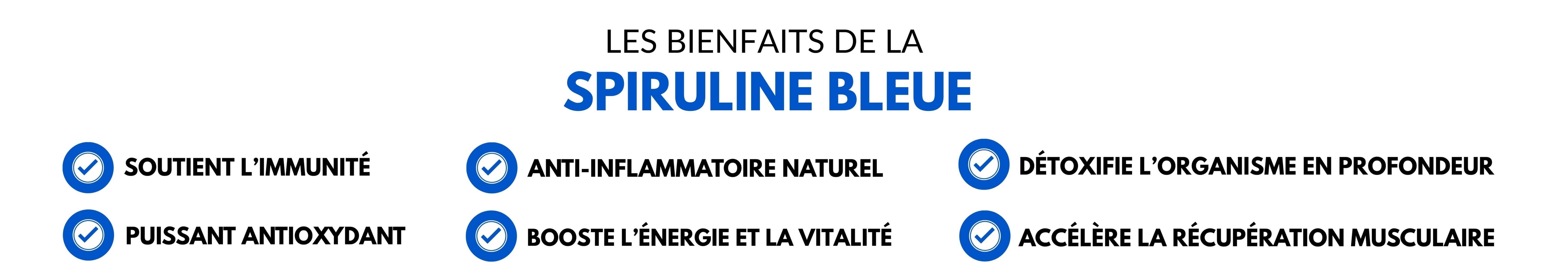 La spiruline bleue est réputée pour de nombreux bienfaits grâce à la phycocyanine qu’elle contient en forte concentration. Voici ses principaux effets bénéfiques :